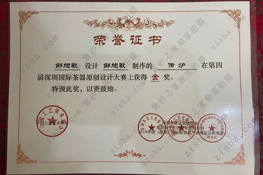 鄒旭敏老師設(shè)計制作的傳爐壺,在第四屆深圳國際茶器原創(chuàng)設(shè)計大賽上獲得金獎。