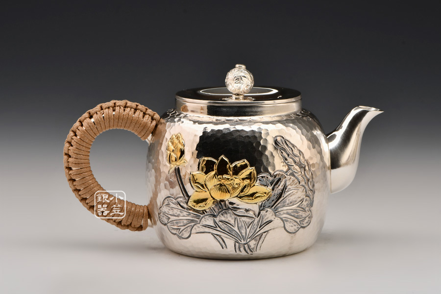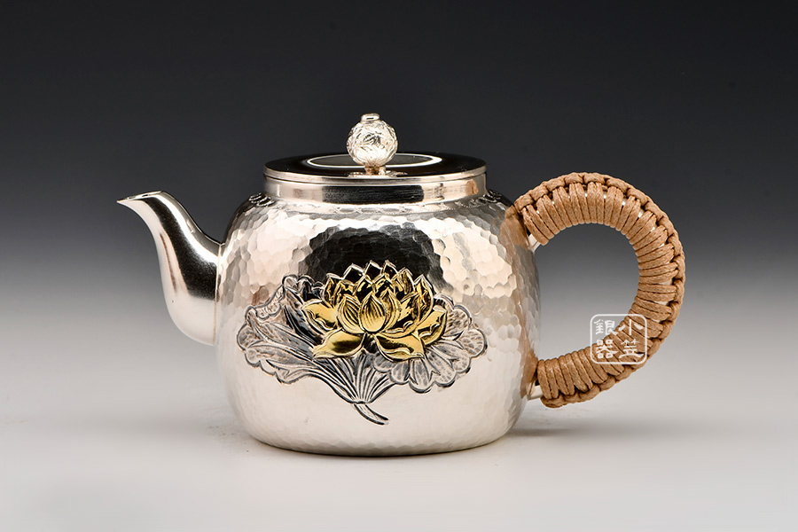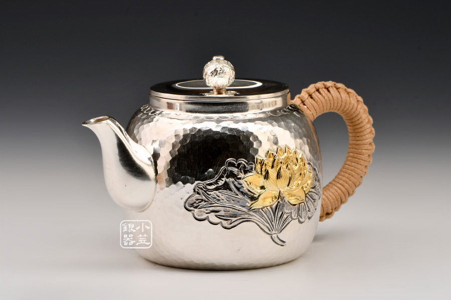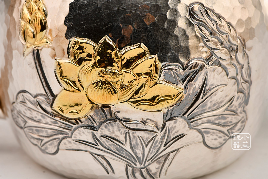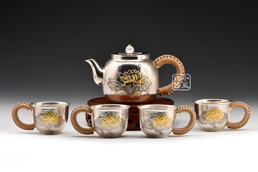 純手工錘目紋,鏨刻荷韻,雅光、鍍金裝飾,材質(zhì):足銀999;急須壺:254克,容量:250CC;單杯:58克,容量:40CC