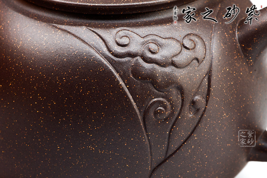 壺的壺口比較大,茶葉進(jìn)出很方便。壺身橢圓,以如意點(diǎn)綴;壺肩向下伸展,壺蓋平整,壺嘴短平寬,出水流暢,搭配上耳形壺把,的確是非常精美。