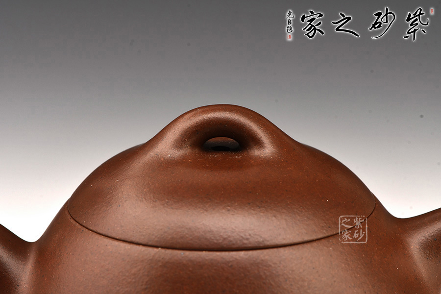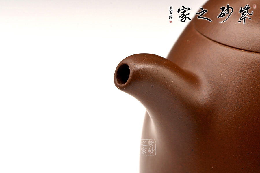 秦權(quán)壺仿秤砣形制,壺身挺拔由下至上收斂,天然流通;流短有勁,環(huán)耳形把手,不矯不揚(yáng);嵌蓋微鼓,沿蓋品天衣無縫;鈕似橋頂。整壺曲線柔和流暢,造型渾厚樸拙,簡練大方。