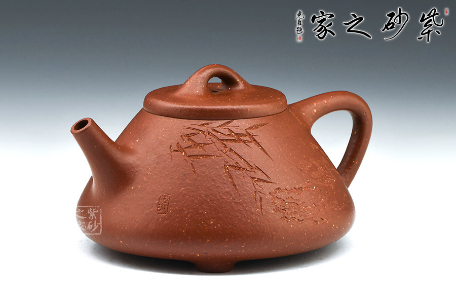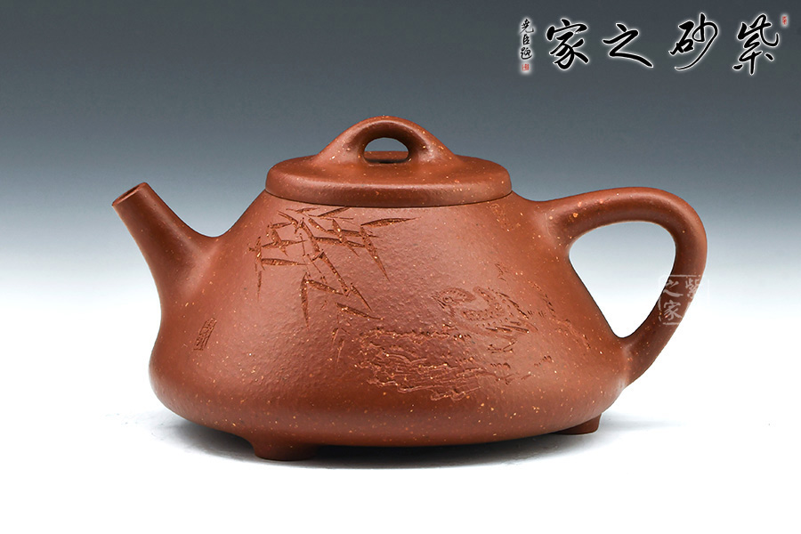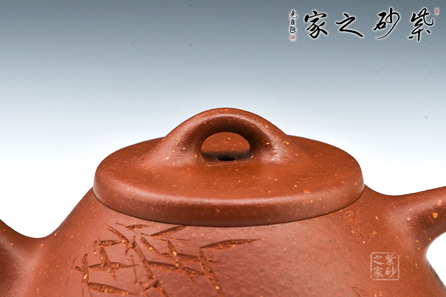 子冶石瓢被歷史定義為融入“三角”概念最為成功的案例,壺體非常穩(wěn)重,整器剛勁有力,線條完美。這把壺弧度大,宜書宜畫,刻繪的竹葉清曠動(dòng)人,顯現(xiàn)了簡(jiǎn)樸大方的氣度,真是智欲其圓、行欲其方、剛?cè)峒媸?