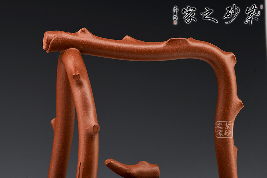 作品采用樹樁主題,與傳統(tǒng)的相比有作稍些改變,壺嘴、壺把與壺鈕均作樹枝狀處理,疤節(jié)橫生,蒼老勁挺,樹枝之上枯枝新芽,新奇別致。