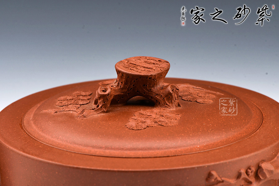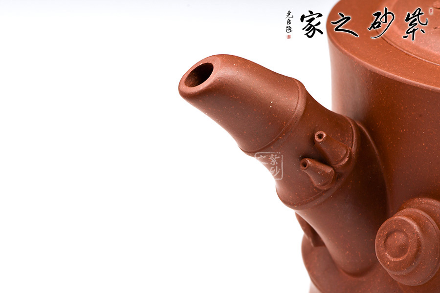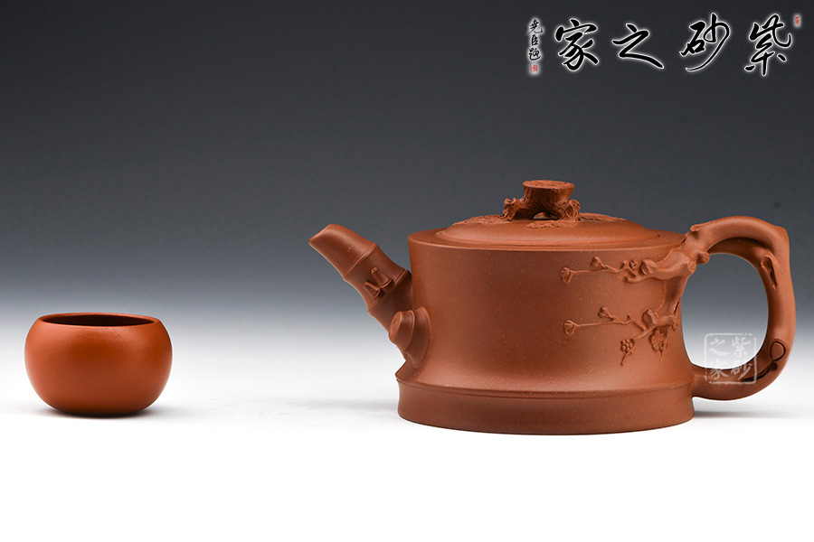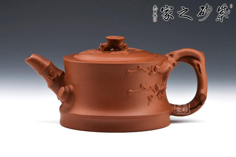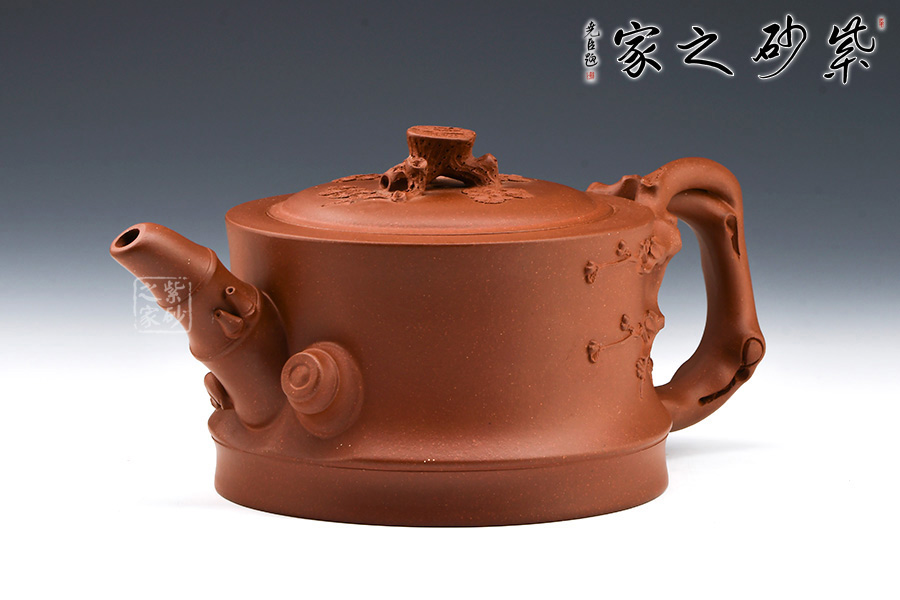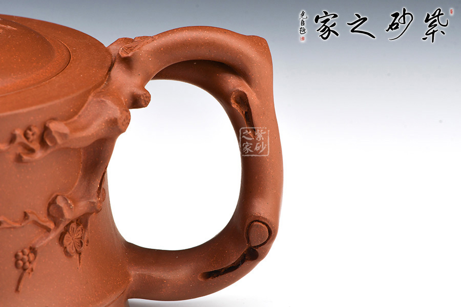 壺鈕以松樹樁蒼涼為感,枯藤古樸,形象逼真。壺把則是以梅枝為韻,宛若一顆蒼勁的梅樹,彎曲叩首而成,梅花鮮艷綻放,若暗香浮動(dòng)而來(lái)。壺身與壺嘴皆以竹節(jié)為原型,端正淳樸,給人一種高風(fēng)亮節(jié)之感。整壺給人之感,意味無(wú)窮,值得把玩。