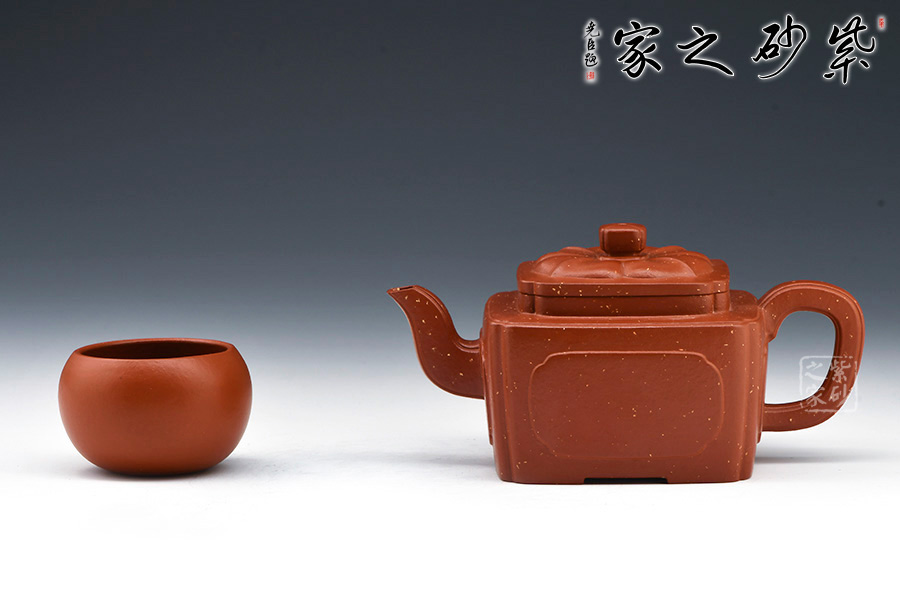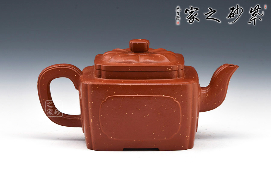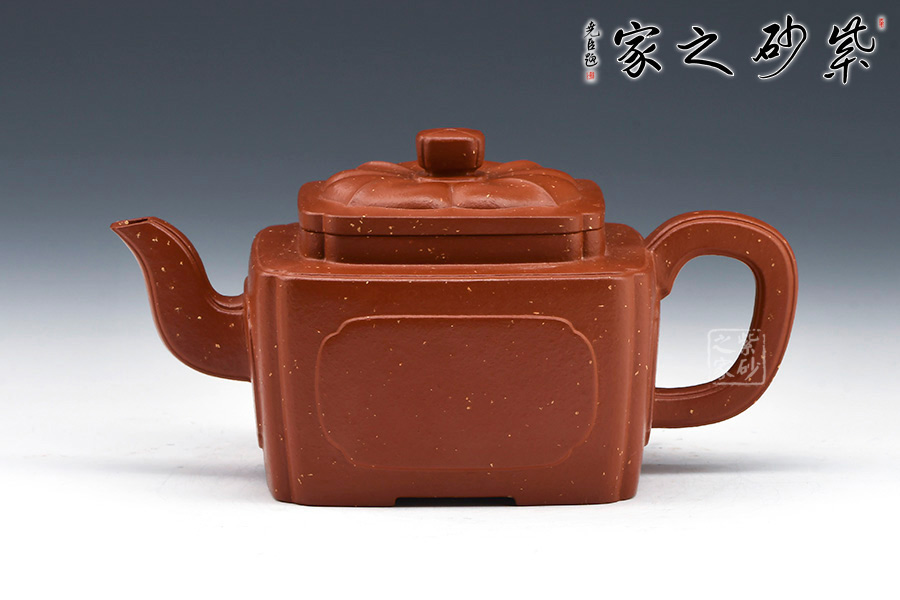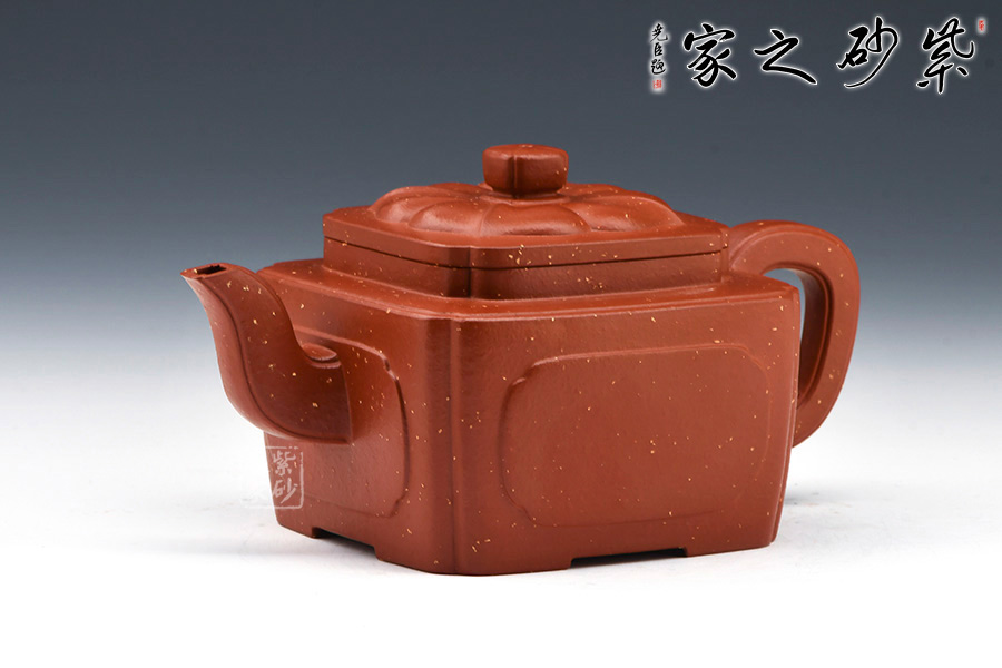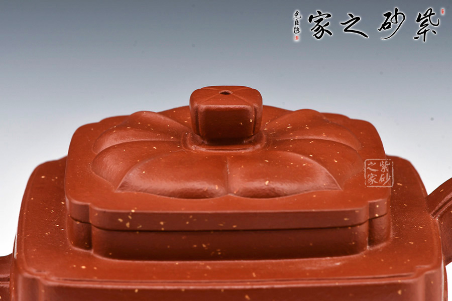 壺身四方,轉(zhuǎn)折圓滑,方中寓圓,清晰利落,顯得平和中正。從上往下,整個紫砂壺就是一朵碩大的錦葵花,壺蓋又是優(yōu)雅內(nèi)斂的花托。不同的角度,不同的觀賞效果,或簡約,或雅致,具有鮮明的現(xiàn)代藝術(shù)的風格。