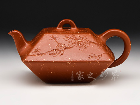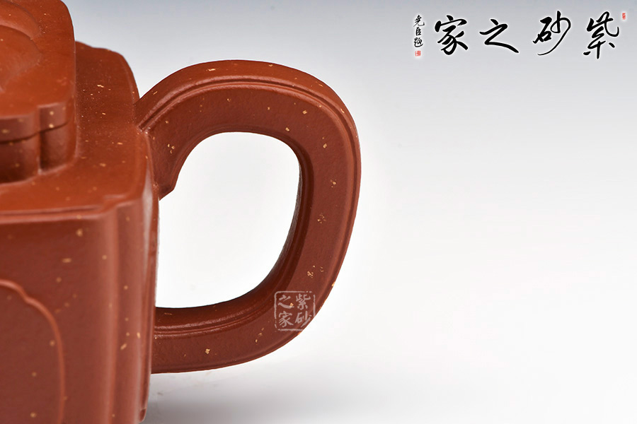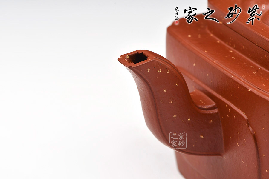 赤龍煥彩,采用家藏大紅袍朱泥底料結(jié)合極其珍貴黃金段料研磨成顆粒,請教原紫砂廠練泥車間老師傅,進行多次配比實驗,燒成后黃金段顆粒自然排列有如龍之金鱗,融合的大紅袍朱泥特性,故名赤龍煥彩。