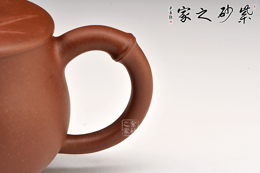 壺身是器型飽滿,線條柔和,肩頸線條自然。底部圈而平和,更顯穩(wěn)重。壓蓋平整光滑,其上的竹段壺鈕美觀逼真。壺嘴和壺把皆用竹為型,加以巧妙利用。壺嘴設(shè)計,以竹節(jié)裝飾壺彎,顯得更加清新。壺把竹節(jié)自然,拿捏適手。