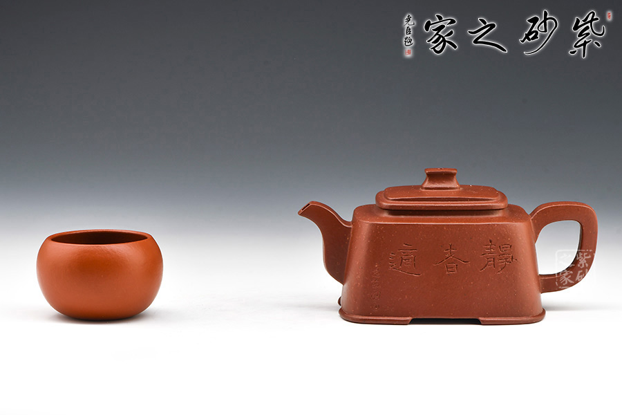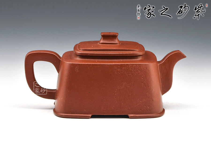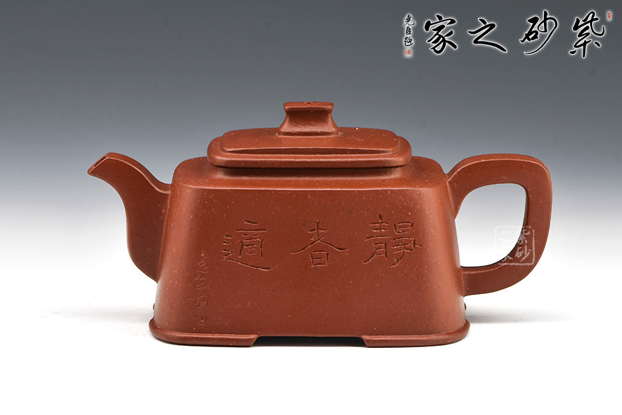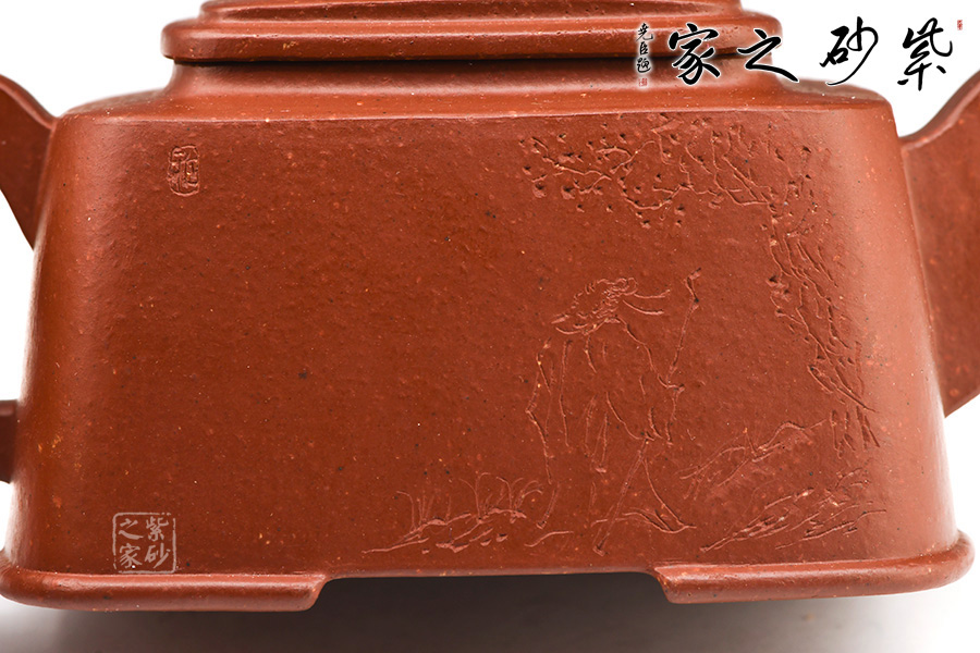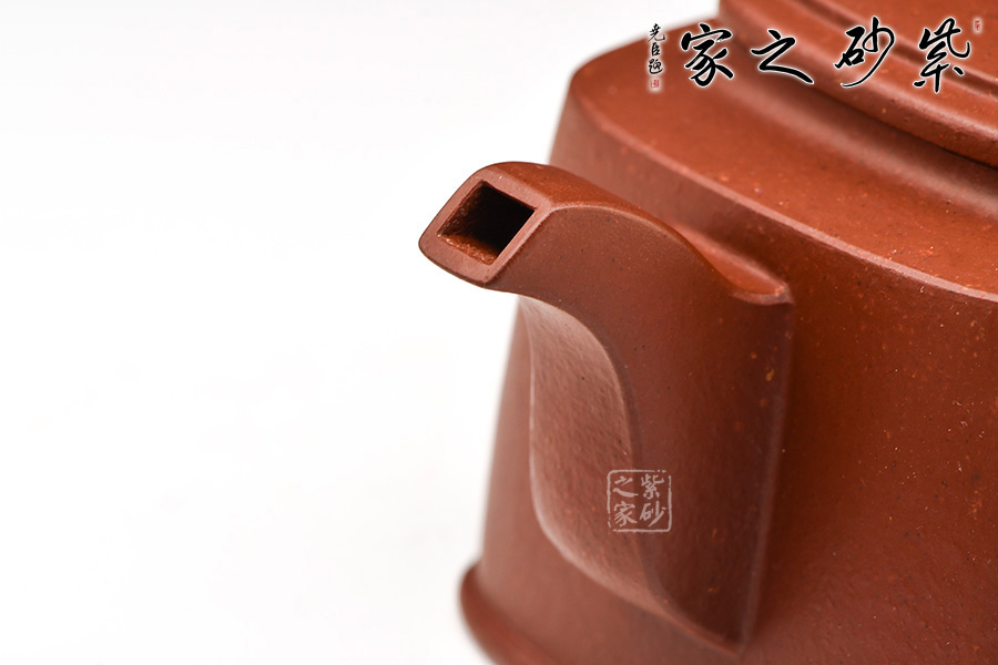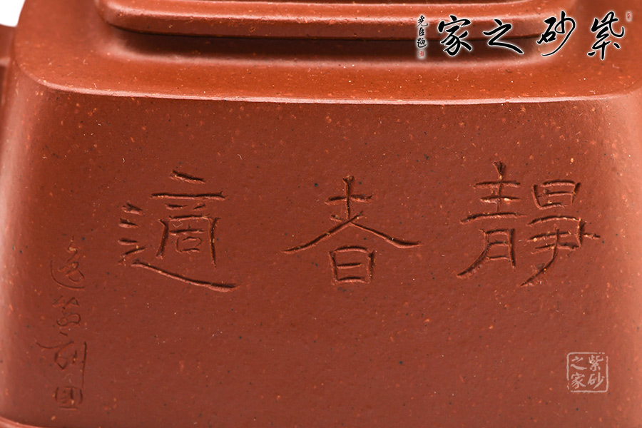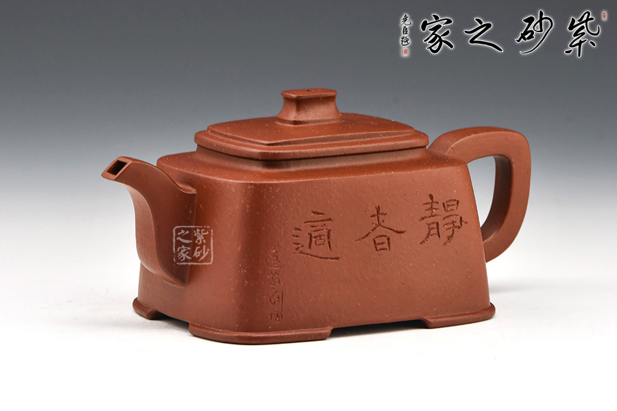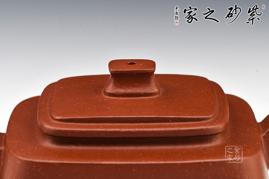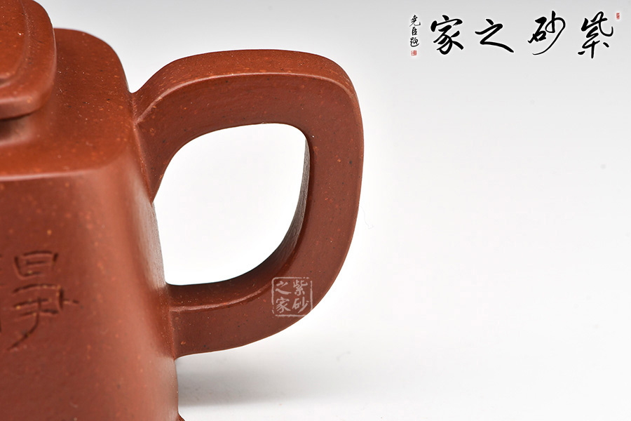 此壺壺型方正,做工細(xì)致,壺身線條柔和飄灑,紋理簡(jiǎn)單大氣,色澤淳樸典雅。壺身方而不銳利,壺蓋圓而泛霞 光,橋形鈕孔洞呈如意形,壺把、壺嘴皆呈方形,整個(gè)壺體剛?cè)岵?jì),婉轉(zhuǎn)而又大氣。