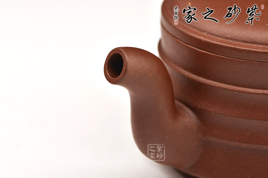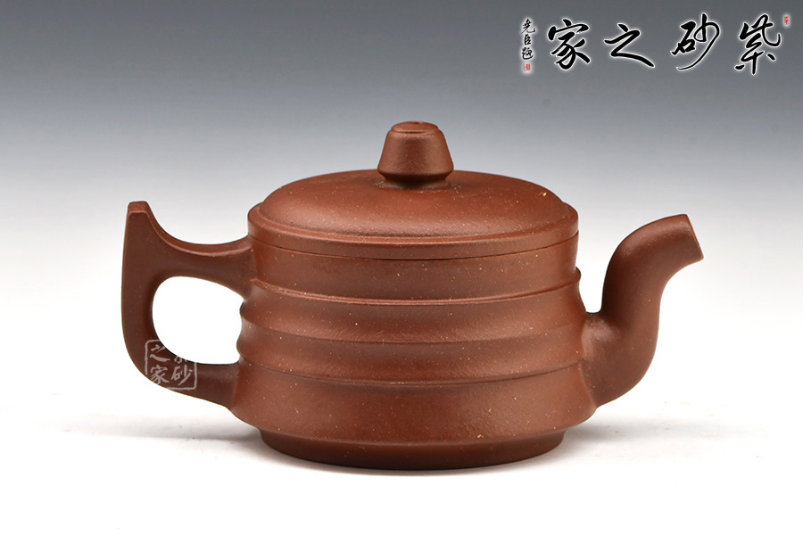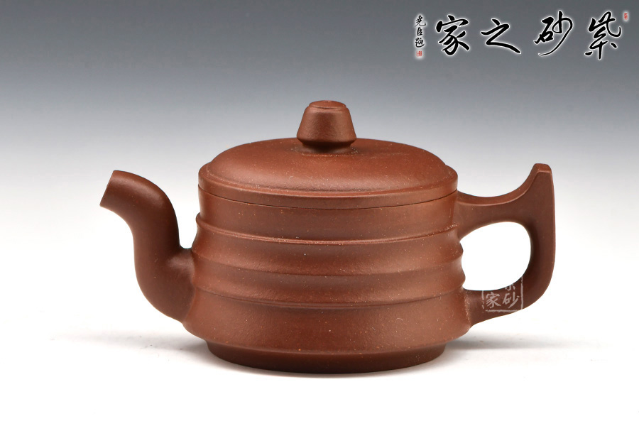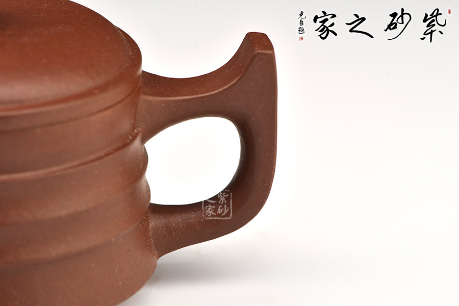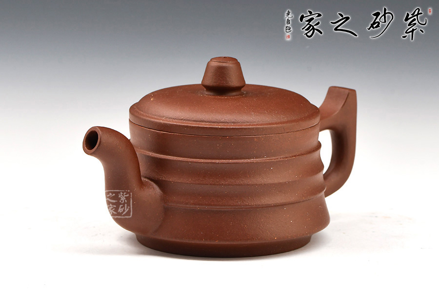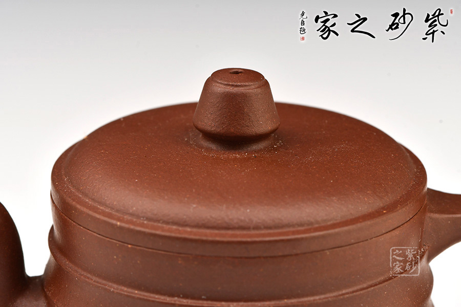 壺身為扁圓柱形,上收下闊,底收窄,簡(jiǎn)潔穩(wěn)重。壓蓋面,中間稍鼓起,其上秦權(quán)形鈕。直流自壺腹胥伸自然,把高挑圓潤(rùn)與流對(duì)應(yīng)稱勢(shì)。紋理清晰,線條順暢,具有韻律之美。